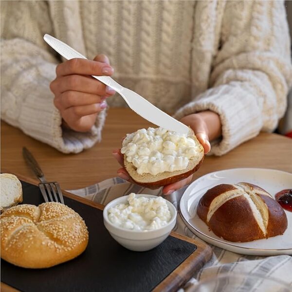 These heavyweight white plastic knives are designed for durability and convenience in foodservice environments. Individually wrapped for sanitary handling, they are ideal for restaurants, catering services, and take-out establishments. The sturdy construction ensures strength and resistance to bending, making them suitable for a variety of foods, both hot and cold. The sleek white color offers a clean, professional appearance, while the individually wrapped design ensures easy and hygienic access for customers and staff. These disposable knives provide an efficient solution for maintaining cleanliness and hygiene in high-volume foodservice settings.